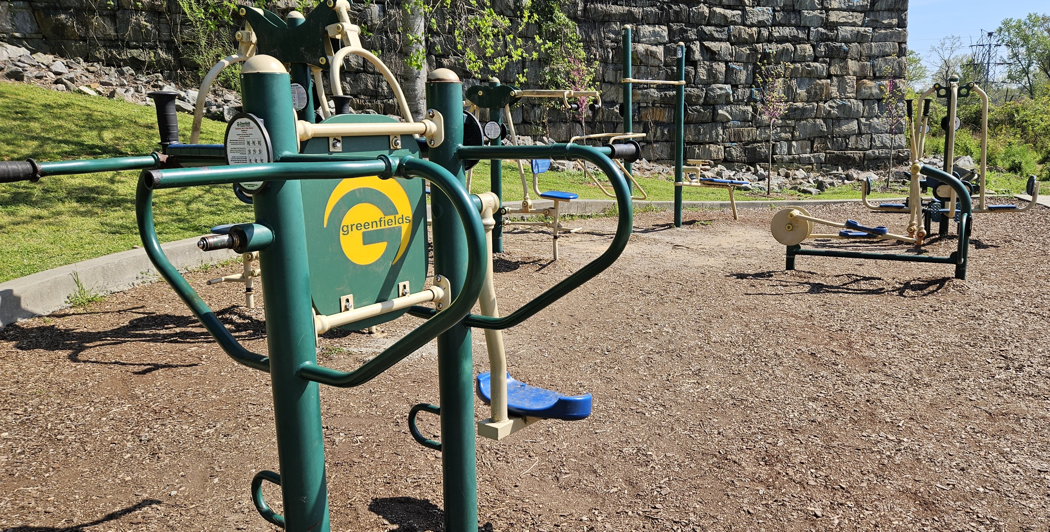 At the bottom of the trail is a playground for children who have not worked off enough steam on the walk down. No, wait; it’s not for children, it’s a workout center for adults who have not worked off enough steam after jogging the four-mile river trail. Whichever – it’s a beautiful location.