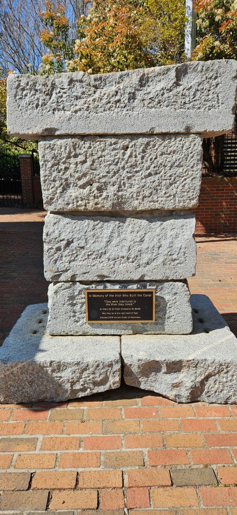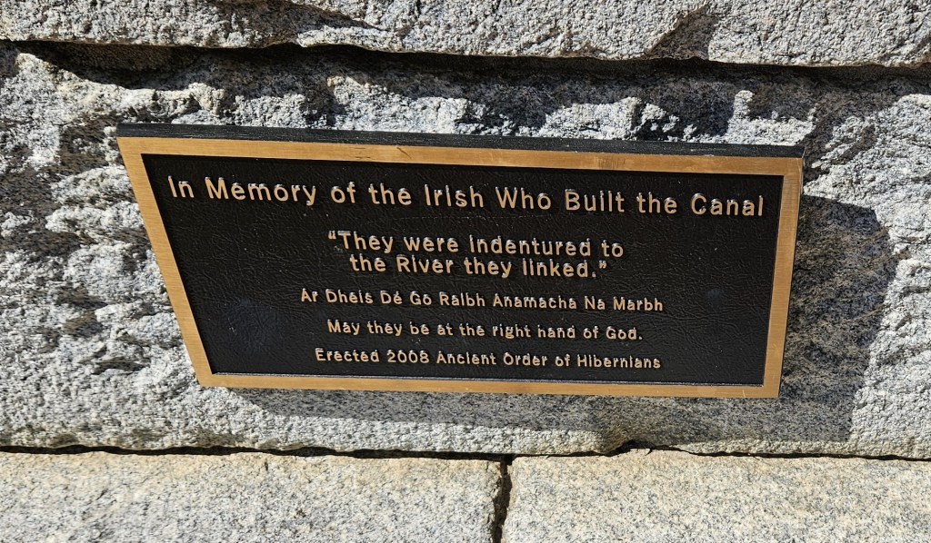 Further down we spot a building off to the side, which turns out to be the former operating station for the canal. Facing the building is a monument to the Irish worker who helped build the canal. I remember that at the time of the canal’s building there were probably signs in downtown Columbia reading “Help Wanted: No Irish Need Apply”, and felt pleased that this maligned immigrant group was receiving recognition.