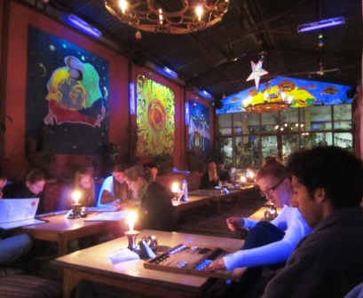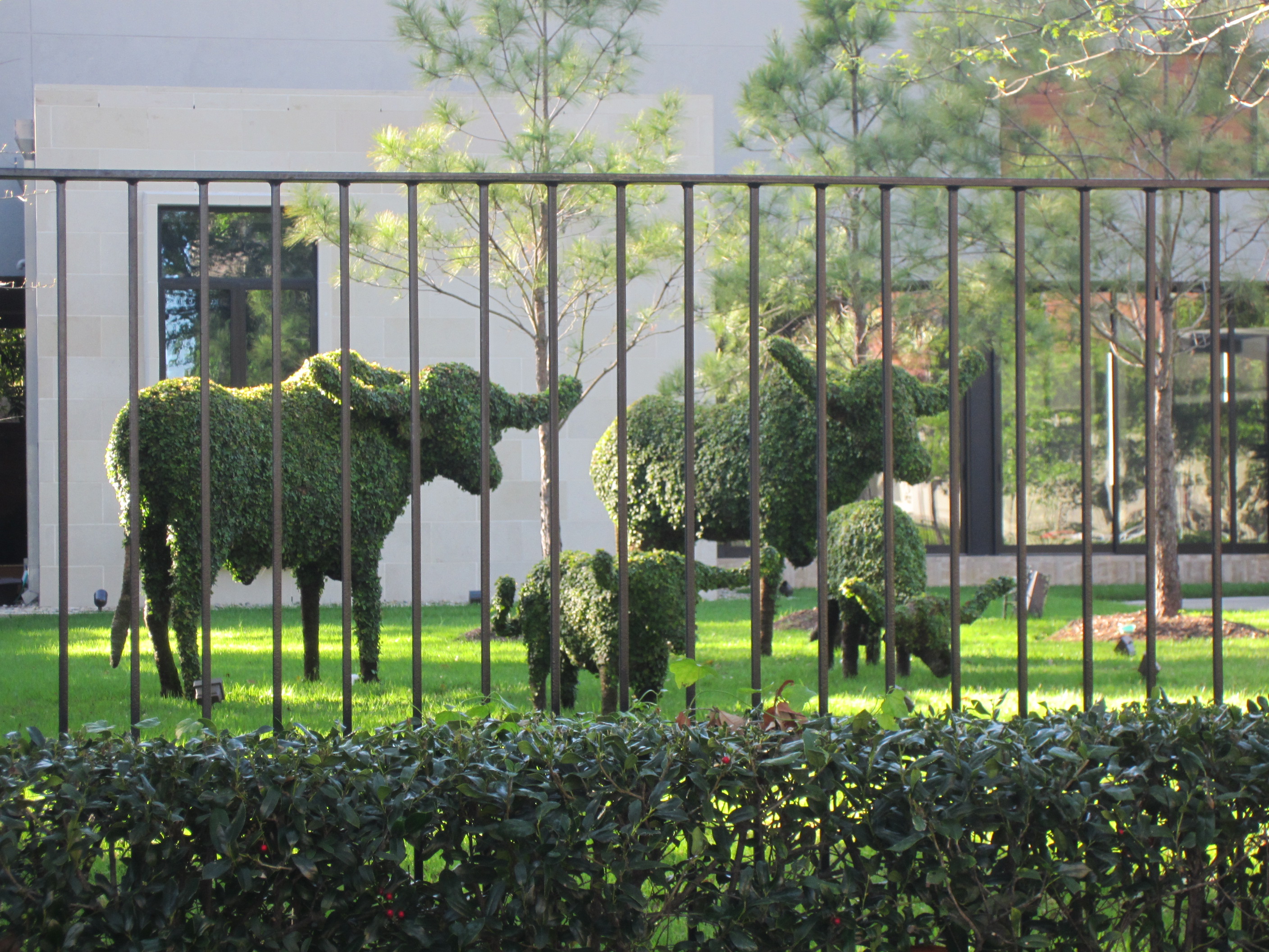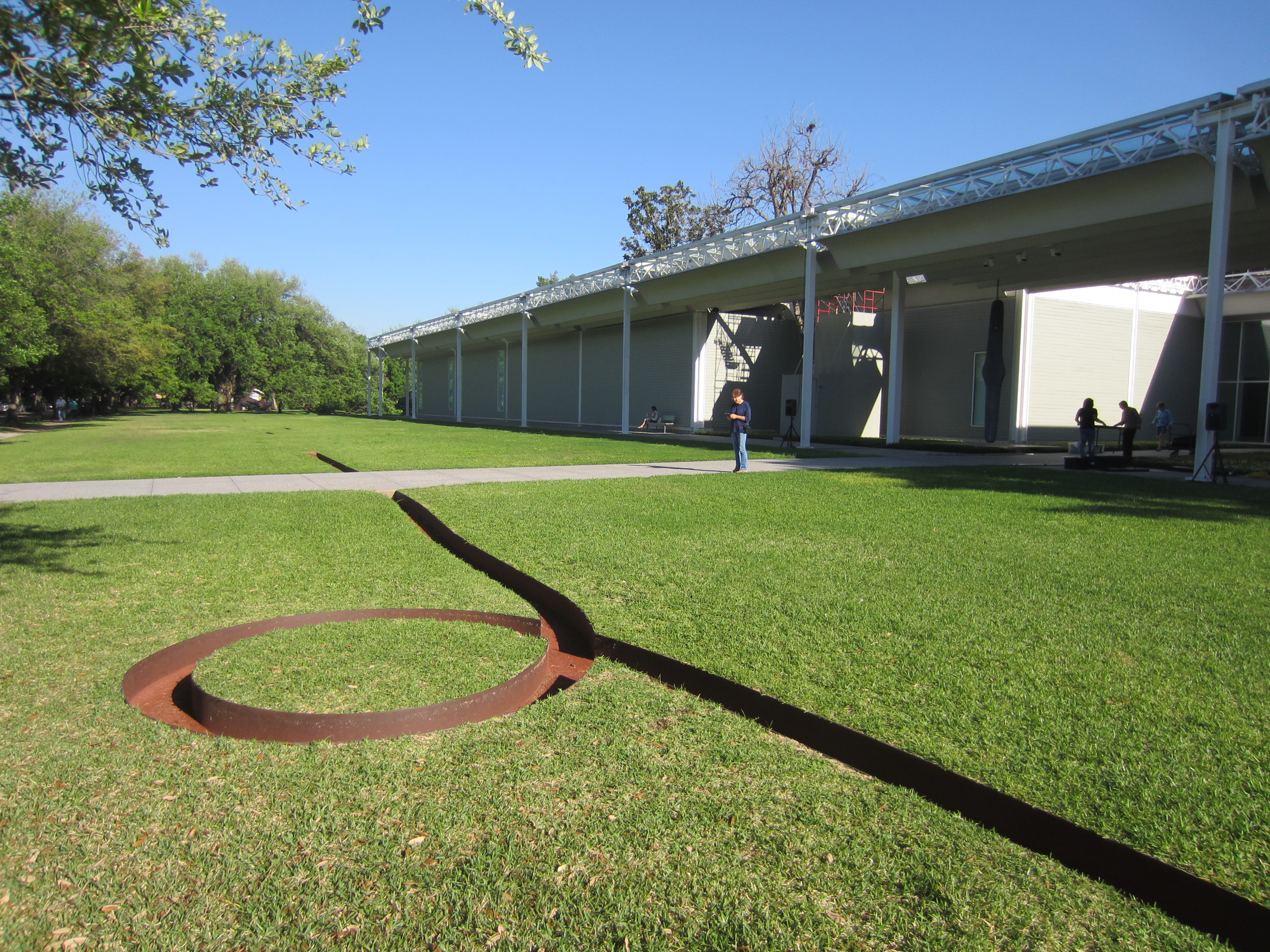 Then to the Menil Collection – an amazing private collection of modern art open to the public free of charge, hidden away in a Houston neighborhood near Rice, filling a large central building plus a warehouse, two bungalows, and a few other out-buildings with modern art – lots of Magritte, some Braque, some Royko, and other artists too arcane and indecipherable to mention. The photo is of one of the outdoor sculptures which reminded me of Stanford’s “Stone River” – a channel about 8 inches wide and 6 inches deep, lined in rusted steel, running across the lawn now straight, now curliqueing, now invisibly coming up into the air, then bouncing down again… oddly fascinating.