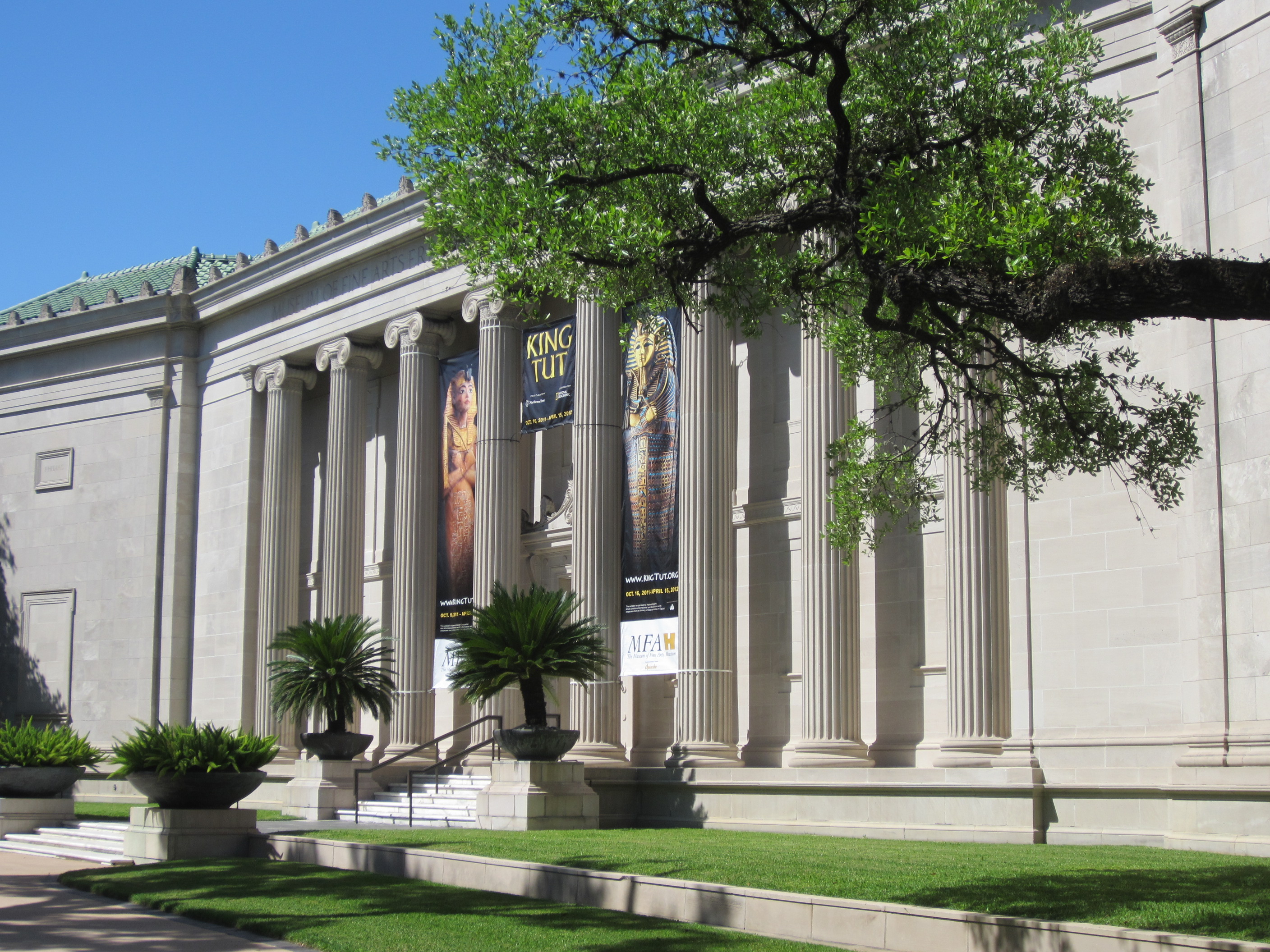 Up, shower, tea, yogurt, on the bikes by 9:30 – to the Cafe Croissant- Brioche, home of excellent croissants almost up to Rue Cler standard. Lingered over cafe latte, then biked through the leafy lawny street of the Rice University neighborhood (the trees really do meet over the center of the street – though many died in last year’s drought) and along a bike trail through Hermann Park, into the Museum District. The Houston Fine Arts Museum spreads across several large buildings – we parked alongside a medical building and negotiated our way across the light rail line (much fancier cars than the SJLR), past the bag checkers, into a subterranean tunnel with a light sculpture effect which was quite magical (an optical illusion which created walls of color where none existed) and up and down and up until we reached the “Tutankhamun: the Golden King” installation.