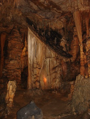 Finally the guide appeared, unbarring the second opening. Then she led us among marvelous columns and curtains of frozen flowing limestone, spangled with calcite crystals and painted in gold, red, and blue from mineral deposits. We saw a well which once held the skeleton of a trapped cave bear, and a deep crevice in which had been found mysterious coins from the 15th century, indicating that someone had discovered the cave centuries before it became known in the 19th century, and apparently escaped alive though slightly poorer.