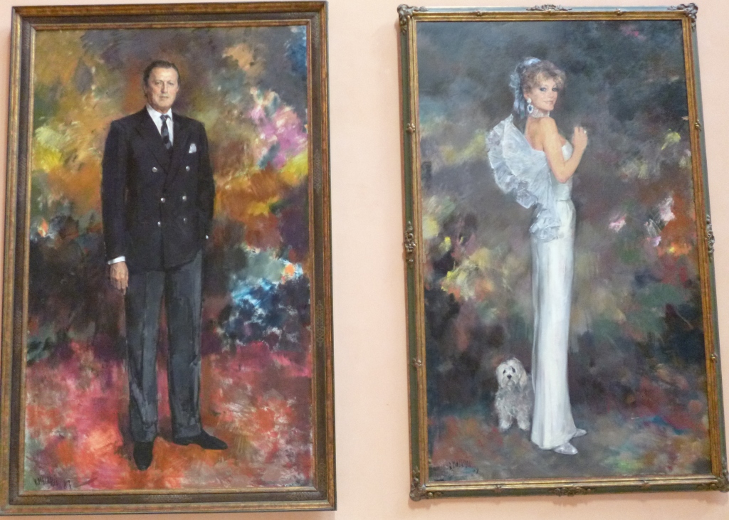 The state rooms are, of course, all tapestry, chandeliers, and mirrors, with frescos on the ceilings painted by Tintoretto and Velasquez and other lesser lights. We also got a glimpse of some of the rooms which had been used as private living quarters by various monarchs; these had been decorated to match then-current tastes and ranged from a faux-Tyrolean-beer-hall decor for a billiard room through an all-Chinese porcelain and stucco and tile sitting room to an Empire/Egyptian room with sphinx holding up the table.