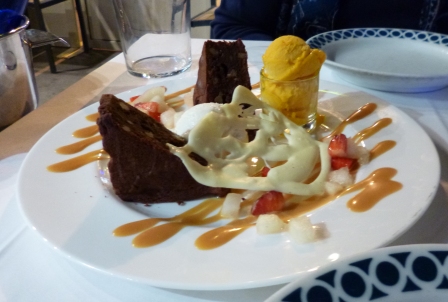 Our maitre’d was unabashedly charmed by Winifred’s Peruvian-accented Spanish, and monitored our table closely as we divided a wonderful salad of grilled vegetables and prawns (with heads and legs still attached to show how fresh they were) followed by a sole in the same state for the same reason but expertly divided and de-boned, followed by a dessert of chocolate brownie plus trimmings, and a couple of complimentary cuplets of cherry liqueur as a gift of the host. We were very glad we had dressed for the occasion!
