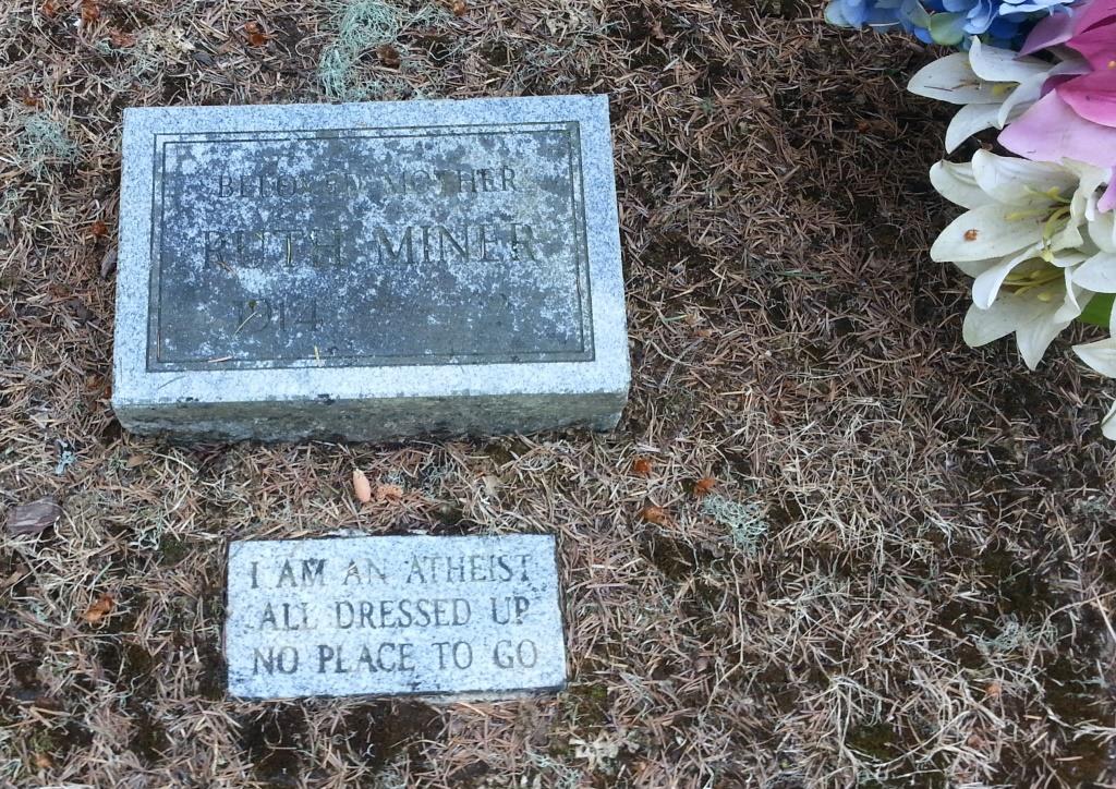 My favorite was the grave of “beloved mother” Ruth Miner. Her simple black marble plaque was carved with her name, birth, and death dates. Just below was a second carved marble plaque announcing “I AM AN ATHEIST ALL DRESSED UP NO PLACE TO GO”.