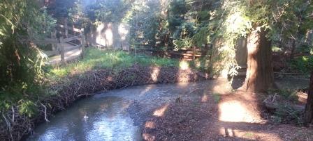 The creek meandered through second-growth redwoods between banks carpeted with ivy and ferns. Sunlight filtered through the trees. The path became a boardwalk which wandered randomly beside or over the creek Along one meandering curve an erosion restraint had been built out of woven willow branches – true functional art.