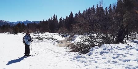 Gary had told us that we could keep the boots, skis, and poles if we wanted to use them for a second day, and we decide to try a different loop at LTCC the next day, going in the afternoon when the ice might be melting and the going (and falling) a bit less crusty. A good long soaking in the time-share hot tub has kept the bruises at bay, and we are confident that a second day will see vast improvement, especially since we have both watched a couple of YouTube videos on beginning cross-country skiing.