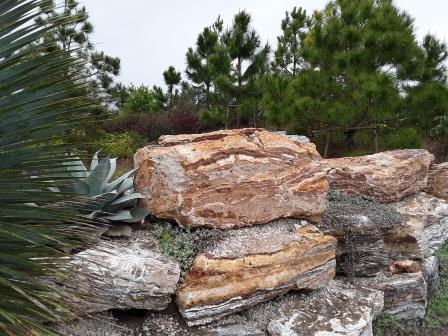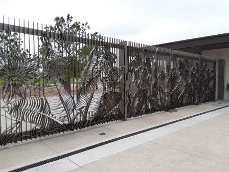 The entrance to the garden is austerely modern, but the fence by the gate gives a better idea of the kinds of richness behind the entry. The garden recreates a diversity of ecological settings, punctuated with fountains, raised beds, and a variety of eccentric artwork.