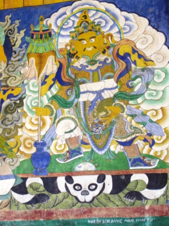 Following our descent and our mollifying the sellers by purchasing several scarves, necklaces, and whatnot, we made it back to the hotel for lunch. After lunch DM and I visited a Buddhist monastery (brand new and painted lavender, for some reason). Murals outside the shrine depict the “King of the North (China), yellow-skinned and standing on a panda. The King of the West is pale-skinned and stands on a Lion – influenced by early British contact, maybe? The King of the East (Tibet) stands on a tiger, while the King of the South – the Kathmandu region relative to Mulktinath – stands on an eland. Inside the shrine has the usual portraits of current and former Lamas, but the monastery is down to only five monks.