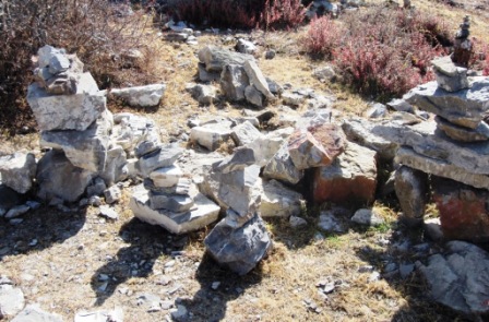 The hills behind the site are a spider web of prayer flags; the path up to the site is lined with stones piled one atop another – these are believed to be homes provided for souls which have not yet found their way to judgment, so building a nice one for yourself in afterlife is a good investment of time – especially if you need to pause for breath while climbing the stairs at 3800 M.