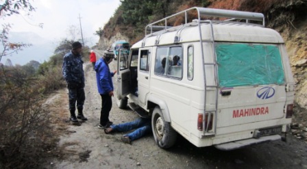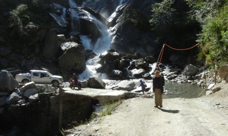 Stage 2 – We arrive at Ghansa about noon. The driver refuses to drive any further, as the bridge has washed out at the Rutche falls and there is no turnaround. So we resume our packs and hike for two hours, plus a lunch stop just after making our way over the washed -out bridge, until we get to Tithze (?) where we hope to hire another jeep. The walk is actually very pleasant – cool, bypassing the road, and it feels good after the hard seats and bouncy suspension of the jeep. But yet to come was