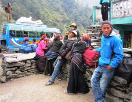 Stage 3 – at Tithze, no jeep is available – all have been booked by folks who walked faster than we did. Bina books us on the next available bus, which was third in line to leave – again, the earlier buses had already filled with an eclectic collection of Tibetan refugee women in their colorful woven aprons, young Nepalese men in blue jeans, and a swarm of trekkers from Germany, France, Australia, the US, and many other points, in various stages of grunginess and grumpiness.
