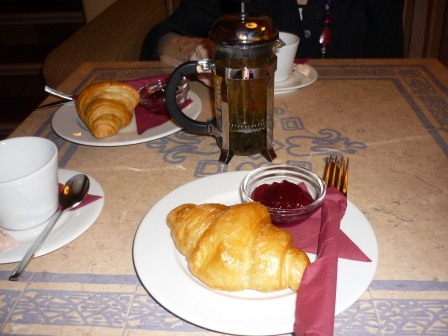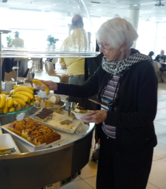 Back at the boat, we had our first served lunch rather than the buffet – delicious salad, beautifully served – irresistible desserts. Back in our spacious suite, Mom napped while I struggled to send a simple email – it seems Hotmail is technically challenged in exotic locales.