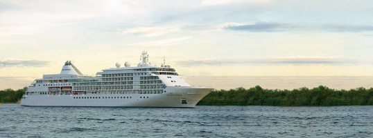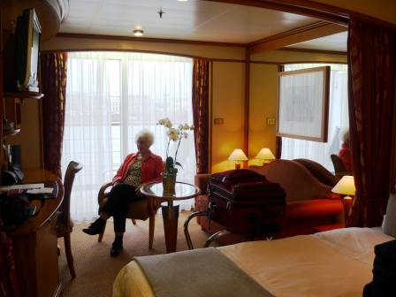 At the boat – Silversea Cruises Silver Whisper – a different world. A trio of beige-shirted porters materialized as soon as our driver had unloaded our three suitcases – I had put the Silversea tags on before leaving the hotel. Whish! A wheelchair appeared and Mom was enthroned. Poof! Our luggage had disappeared, to reappear magically in our suite after our lung. Kowabunga! We were through customs, checked into our rooms, and sitting down for lunch in the Panorama Lounge. We had been “welcome aboard”ed so many times our heads were spinning.