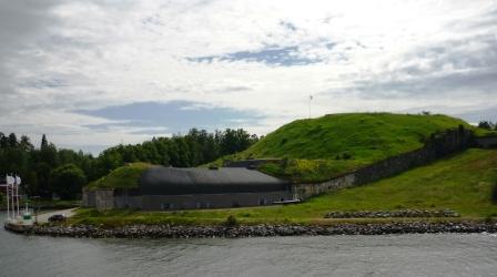We are very close to some of the small islands – suddenly we are passing a very serious looking gun emplacement with pillboxes set into the hill and large cannons looming. Guns of Stockharone?