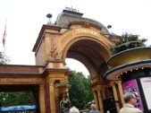 While Mom was napping I went over to the station two blocks away to get some kroner for the evening. The neighborhood is a bit dubious – the train station is surrounded by dozens of freshly refurbished “boutique” hotels with Danish design furniture and orchids in the lobbies, but also there is a generous sprinkling of sex shops and strip clubs. I resolved to get to Tivoli early, find some food, admire the lights, and return decorously to our hotel via the busiest and best-lighted streets.
