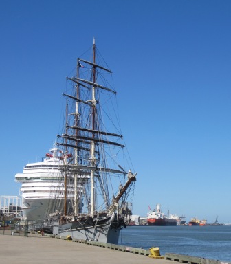Down one brick-paved street loomed the huge Art Deco train station dating to the days when Galveston was the largest port in Texas; down another loomed an equally bulky Carnival cruise ship. The harbor was hosting myriad types of maritime vessels, including Elissa, “Texas’s Tall Ship”, a couple of oil barges, the Carnival Cruise ship, and an oil drilling platform moored at its own dock and turned into a museum courtesy of Exxon.