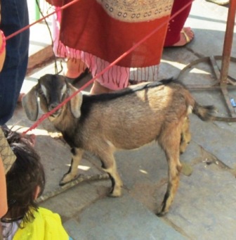 Once the sacrifice is made, the blood is sprinkled on Kali’s image, and the devotee is free to reclaim the chicken, goat, or coconut. Just outside the inner shrine is a shed where the animals are plucked, gutted, and dismembered for later barbequing. The marble floor of the area was stippled with blood drippings and mud – the thought crosses my mind that if I slip and fall I will probably have to be air-lifted to Delhi for blood purification.