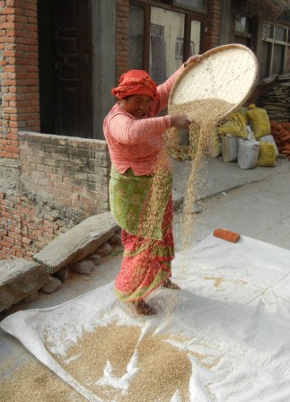 Our final stop is at a traditional Newari village, where women in traditional costumes are threshing and winnowing rice using woven trays – tirelessly filling the trays and tossing the rice to the wind to allow the chaff to float away. Where were the men? Groups of them squat on street corners playing cards with dried beans for markers. “It is a festival time for them,” explains Shaku – but evidently not for the women.