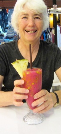Day Two: Shower (After 12 days trekking, I can’t get too much hot water!), laundry, breakfast (those croissants again) , and a little catch-up email at the free Internet computer under the banana trees, we walk to the Street of Silk – shop after shop of beautiful glistening fabrics that made my fingers itch to touch, stroke, fold. Then we took a Tuk tuk (Motorscooter-style taxi) to the Women’s Correctional Institute for afoot massage and lunch. Feet feel great!