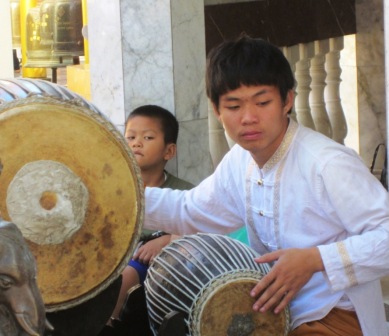We took a taxi to Wat Doi Sethup on the top of the hill, barreling past the lovely campus of Chiang Mai University and the entrance to the Chiang Mai Zoo (pandas there! Shoulda stopped!) The Wat is yet another extravanganza of golden buddhas, golden tile, folk-singing and dancing children from various schools asking for donations.