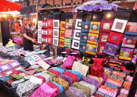 And for contrast that night – the Sunday Street Market. The whole of the main street between the Canal and the temple is given over to street vendors of all sorts – musicians asking for donations, food vendors, book sellers, and the usual wood carvers, weavers, jewelers, gold and silversmiths, etc. Even the Buddhist stupas were selling food, drink, and crafts – no escape! We dropped off to a side plaza to find food at a vegetarian open air restaurant. By the time we finished, the market had become so crowded that it was nearly impossible to move – we had exhausted our gift list just ahead of our gift budgets, and so extricated ourselves and walked back to the hotel for our last peaceful sleep beside the river.