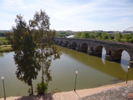 We strolled our way down to the old Roman Bridge across the Rio Tormes, admiring the golden carved façade and gilded carved interior of the Cathedral on the way. It felt a little ho-hum after the Roman remains of Merida and the Conquistadors’ gold we had seen flaunted in Trujillo. From the bridge we turned back to look at the city and spotted the amazing blue-stained-glass Art Deco façade of the Museo de Art Nouveau y Art Deco soaring above the river.