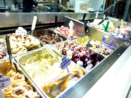 In Salamanca we had our first real culinary disappointment. The desk attendant at our hotel was not the comfortable matron of the afternoon – perhaps it was her son. We asked him for a recommendation to a local tapateria and he sent us to just the place a beardless youth would like: noisy, crowded,cheap ,bright, beery, and full of soccer fans. We fled, but try as we might we could not locate the kind of cheerful,friendly conversation-friendly place we had enjoyed in Caceras. We ended up in a near-by and near-empty joint with only a few middle aged soccer fans clustered at the bar. Too late we realized this dearth was a reflection of the fare and the service, but we were too hungry to look further . We drowned our disappointment in striacchiatti (chocolate chip gelato) and fresh berry yogurt from a shop on the way back to our plaza.